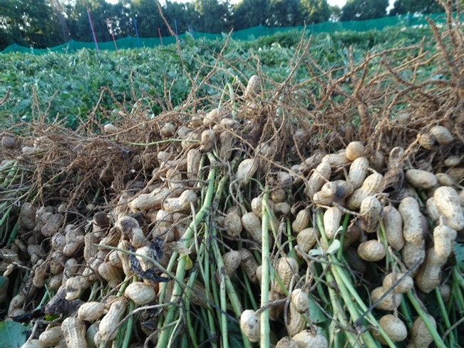 続いて、ラッカセイ(品種「千葉半立」)を収穫しました。株を引き抜き、土を払い、地下部を上にして重ねます。通常ならばこのまま圃場で乾燥させるのですが、最近は獣害が著しいため、運搬車に積んでビニルハウスに収容しなければならず、学生は苦労していました。